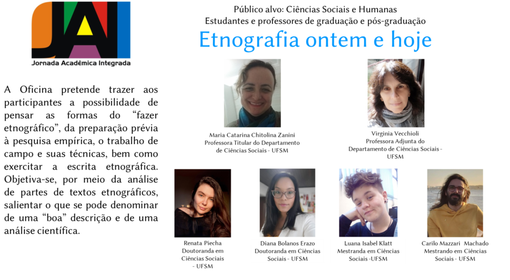 Card branco com fotos dos palestrantes e texto: Etnografia ontem e hoje. A Oficina Etnografia ontem e hoje pretende trazer aos participantes a possibilidade de pensar as formas do “fazer etnográfico”, da preparação prévia à pesquisa empírica, o trabalho de campo e suas técnicas, bem como exercitar a escrita etnográfica. Objetiva-se, por meio da análise de partes de textos etnográficos, salientar o que se pode denominar de uma “boa” descrição e de uma análise científica.