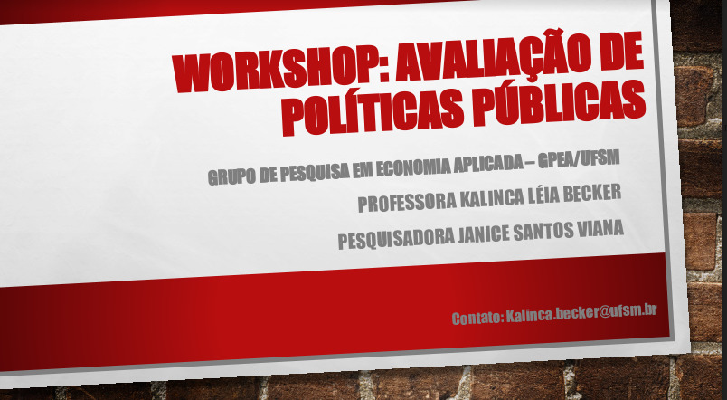A prof. Kalinca Léia Becker (DERI/UFSM) será responsável pela apresentação dos módulos 1 e 2 do workshop e pela condução da discussão, juntamente com os pesquisadores do Grupo de Pesquisa em Economia Aplicada: Janice Santos Viana e Lauana Lazaretti.