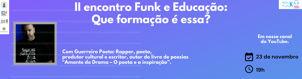 Banner lilás com foto de homem e texto: II Encontro Funk e Educação: que formação é essa? Com Guerreio Poeta. 23/11, às 19h no YouTube EduFunk.