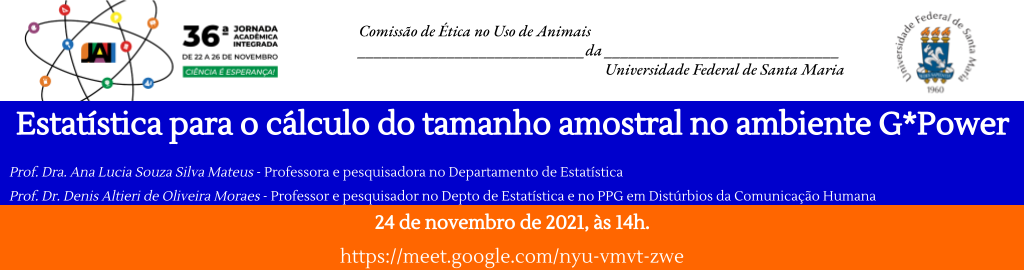Banner branco, azul e laranja com texto: Comissão de Ética no Uso de Animais da UFSM. Estatística para o cálculo do tamanho amostral no ambiente G*Power. 24/11, às 14h, via Google Meet