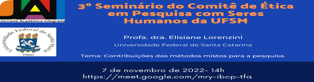 O Comitê de Ética em Pesquisa com Seres Humanos da UFSM atua no âmbito da avaliação ética dos projetos de pesquisa que são desenvolvidos na instituição. Neste sentido, propõe-se o desenvolvimento do 3º Seminário do Comitê de Ética em Pesquisa com Seres Humanos da UFSM.