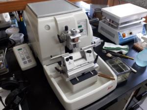 Descrição do Equipamento:  Micrótomo rotativo de alto desempenho, semi-motorizado para cortes seqüenciais e preciso, iniciando em 0,5 micrômetro até 100 micrômetros, de materiais incluídos em parafina e resina plástica. Com suporte N para navalhas convencionais de aço, com inclinação ajustável.