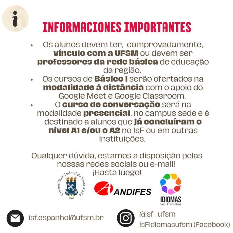 - Ter comprovadamente formação superior ao nível A1 de língua espanhola pelo IsF ou por outra instituição (o comprovante será enviado apenas por aqueles que forem selecionados após contato da organização do IsF espanhol).