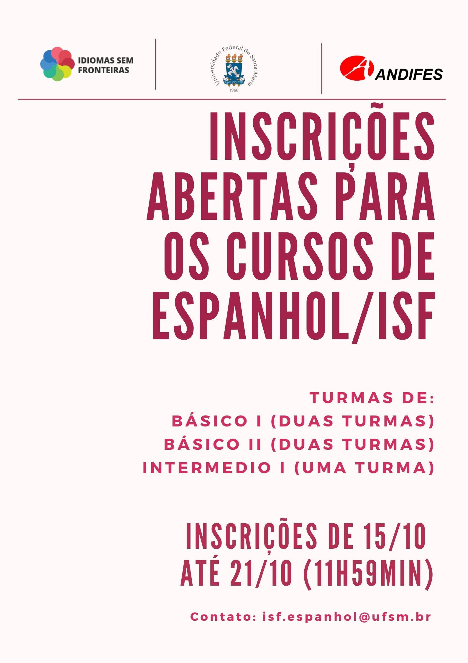 Abertas as inscrições para cursos do IsF-Português Língua Estrangeira/Adicional na UFSMO Núcleo de Línguas da Rede Idiomas sem Fronteiras (IsF) da Universidade Federal de Santa Maria (UFSM) informa que estão abertas as [...]