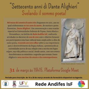 Nel mezzo del cammin di nostra vita chegamos em 2021, ano no qual celebraremos os 700 anos da morte, do escritor e poeta fiorentino, Dante Alighieri. Em comemoração a essa ocasião especial, o Núcleo de Idiomas da Rede Andifes IsF da Universidade Federal de Santa Maria e da Universidade Federal de Viçosa realizarão atividades em torno do autor de A Divina Comédia no decorrer do ano de 2021.