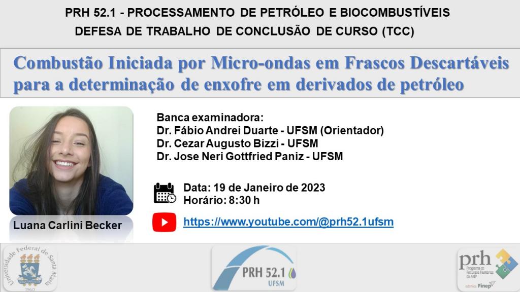 No dia 19 de janeiro de 2023, às 8h30, a discente do Curso Superior de Tecnologia em Processos Químicos, Luana Carlini Becker , apresentará o trabalho intitulado ” Composição Iniciada por Micro-ondas em Frascos Descartáveis para a determinação de enxofre em derivados de petróleo”. A comissão Avaliadora será composta pelo Prof. Dr. Fábio Andrei Duarte (Orientadora), Prof. Dr. Cezar Augusto Bizzi e pelo Prof. Dr. José Neri Gottfried Paniz.