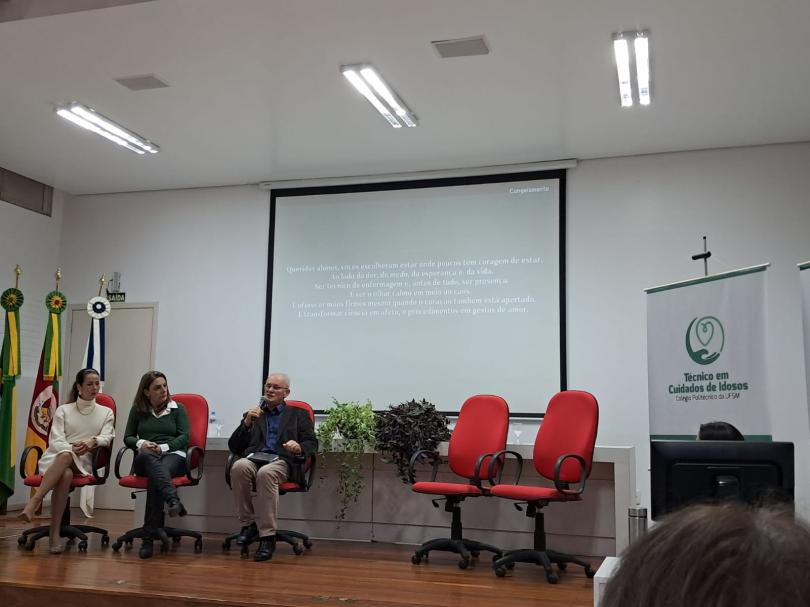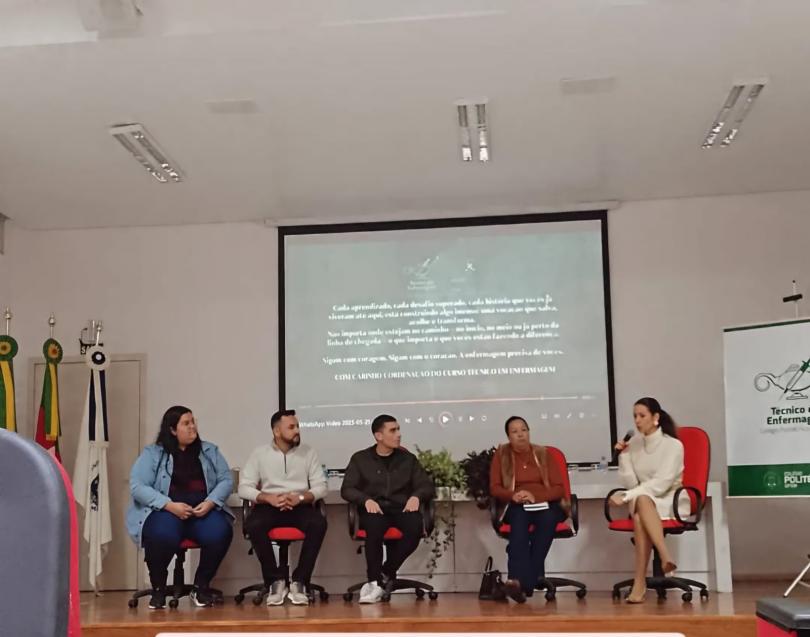 Durante o encontro, a professora abordou o tema “A importância da atuação do Técnico em Enfermagem junto à equipe de saúde”, juntamente com egressos do curso Cristiane Maria Rehbein Bortolotto, Augusto Cortes Mendonça e Idiana Vieira Pedroso, que atualmente atuam em unidades de terapia intensiva (UTI).