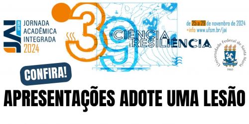Entre os dias 25 a 29 de novembro de 2024, ocorreu a 39ª Jornada Acadêmica Integrada (JAI) da UFSM, um dos maiores eventos acadêmicos da instituição. O Projeto Adote uma Lesão foi representado por bolsistas e participantes voluntários, que apresentaram pesquisas e relatos de experiência, contribuindo para a disseminação do conhecimento sobre prevenção e tratamento de lesões.