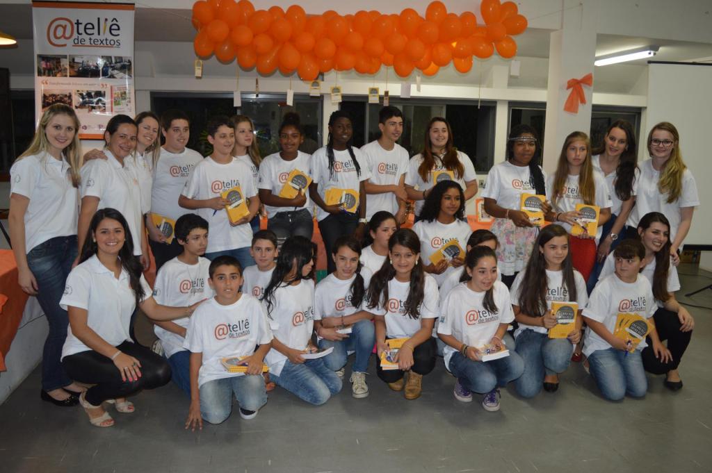 Alunos-autores da E.M.E.F Santos Dumont e integrantes da equipe do Ateliê de Textos no lançamento da coletânea em Agudo.