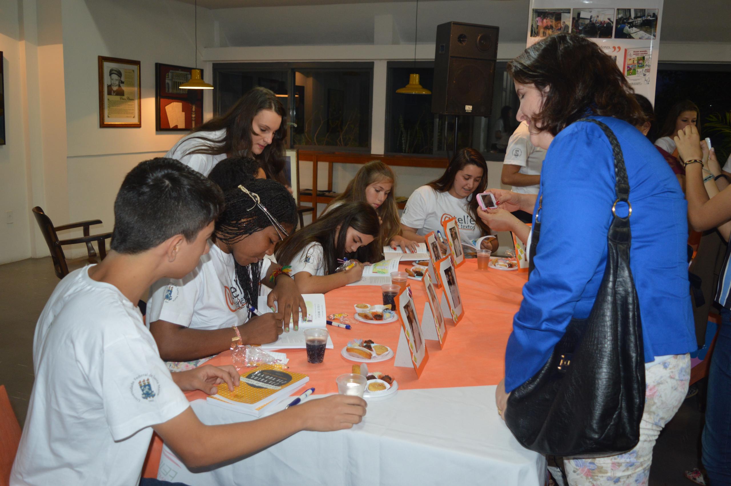 Sessão de autógrafos dos alunos-autores da E.M.E.F. Castro Alves. Foto: Júlia Maia.
