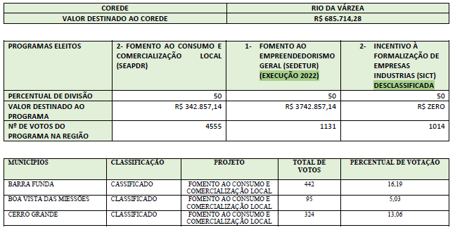 A demanda Incentivo à Formalização de Empresas Industrias (SICT)”, restou desclassificada, por obter o menor índice de votação entre os municípios da região, 1.014 votos. O valor destinado para a Corede Rio da Várzea é de R$ 685.714,28, (seiscentos e oitenta e cinco mil, setecentos e quatorze reais com vinte e oito centavos), que será dividido em proporção de 50% (cinquenta por cento) à cada demanda classificada.