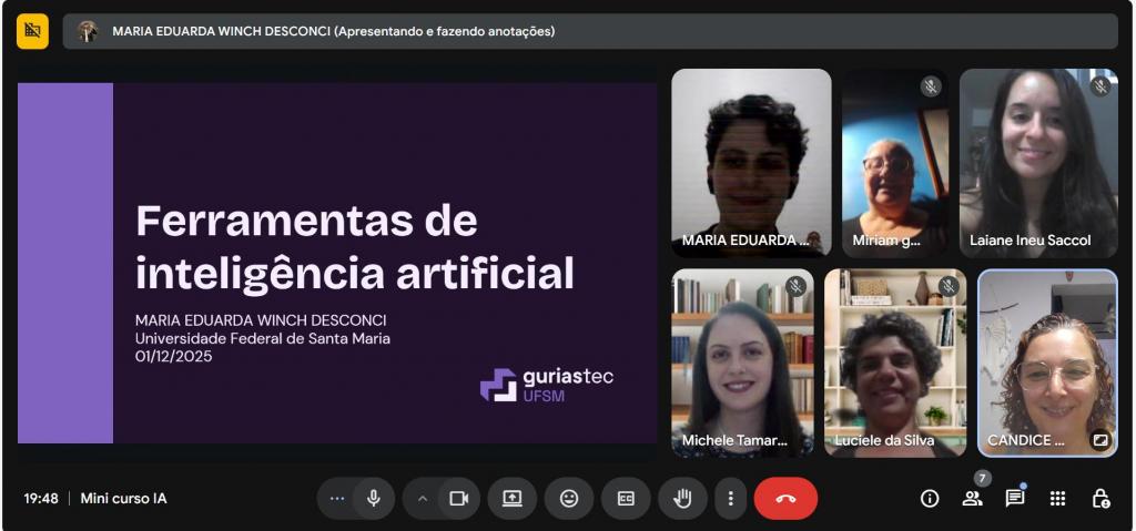 Na última semana, 01, o programa GuriasTec promoveu um minicurso sobre ferramentas de Inteligência Artificial (IA) voltado às professoras das escolas parceiras do projeto. A atividade foi mediada pela estudante do curso de Engenharia de Telecomunicações da UFSM e bolsista do GuriasTec, Maria Eduarda Winch Desconci.
