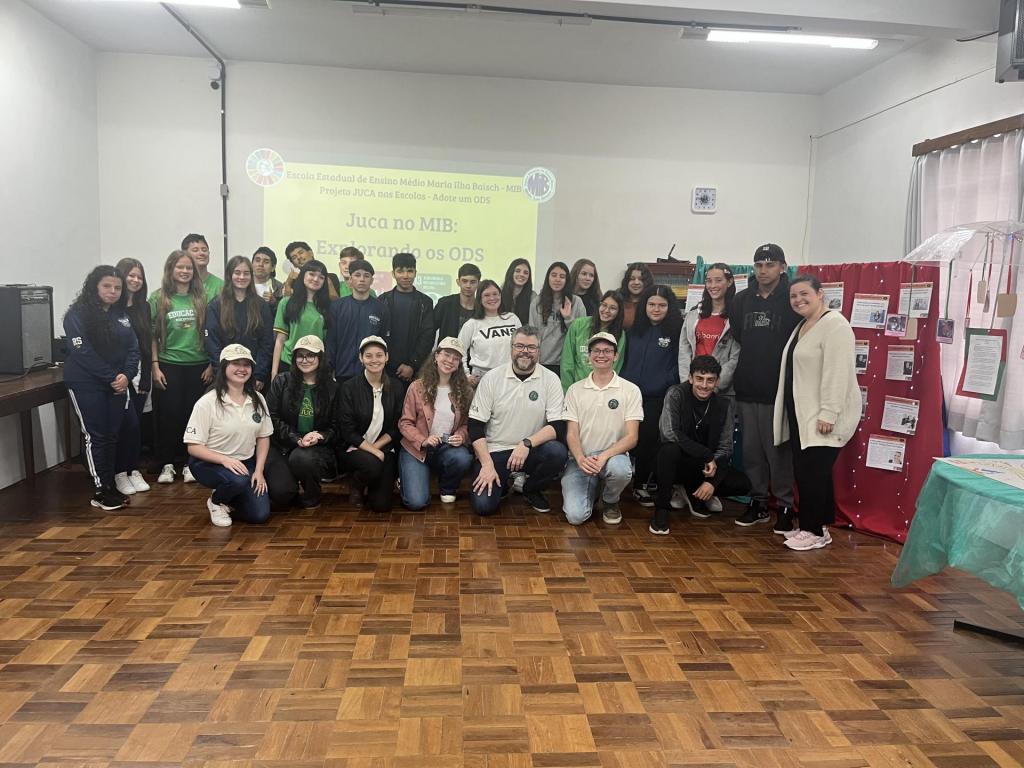 O encerramento da atividade Adote um ODS, realizado no dia 30 de outubro, no município de Dona Francisca, marcou a conclusão de um processo formativo significativo desenvolvido na Escola Estadual de Ensino Médio Maria Ilha Baisch, com a participação dos estudantes do 1º e 2º anos do ensino médio. A iniciativa integrou as ações do Juca nas Escolas voltadas à promoção da educação para a cidadania global, articulando a formação escolar aos princípios e metas da Agenda 2030.