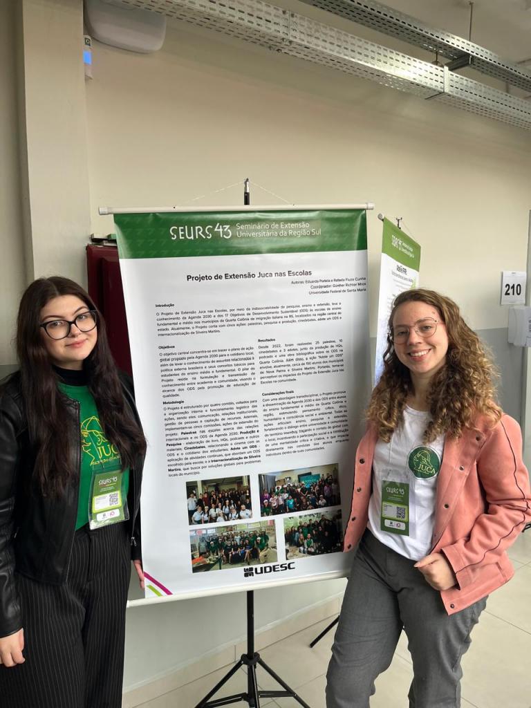 Entre os dias 22 e 25 de julho de 2025, o Juca nas Escolas participou da 43ª edição do Seminário de Extensão Universitária da Região Sul (SEURS), realizado em Lages (SC), na Universidade do Estado de Santa Catarina (UDESC). O evento, que reuniu instituições públicas de ensino superior da Região Sul, teve como tema “Extensão e justiça socioambiental na transformação dos territórios”, promovendo debates sobre práticas extensionistas e seu impacto social.