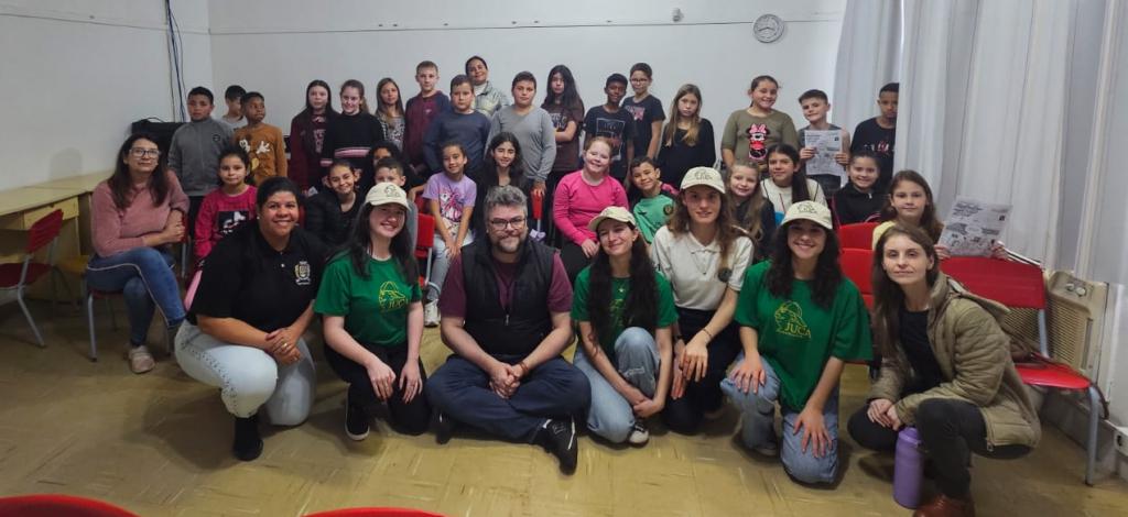 No dia 03 de setembro de 2025, quinta-feira, o programa Juca nas Escolas esteve presente em Dona Francisca, para uma palestra com os alunos do 4º e 5º anos da Escola Municipal de Educação Fundamental Antonio Luiz Barchet. Nesse encontro, conversamos sobre os Objetivos de Desenvolvimento Sustentável (ODS) 12 – Consumo e produção responsáveis, 13 – Ação contra a mudança global do clima e 15 – Vida terrestre. As discussões aproximaram os estudantes das questões ambientais, incentivando reflexões sobre como práticas de consumo consciente, preservação da biodiversidade e enfrentamento das mudanças climáticas estão diretamente relacionadas à realidade local. Para tornar o aprendizado mais dinâmico, foi realizada uma atividade lúdica semelhante ao jogo do “morto-vivo”, adaptada para o tema da sustentabilidade, estimulando a participação e a fixação dos conceitos apresentados.