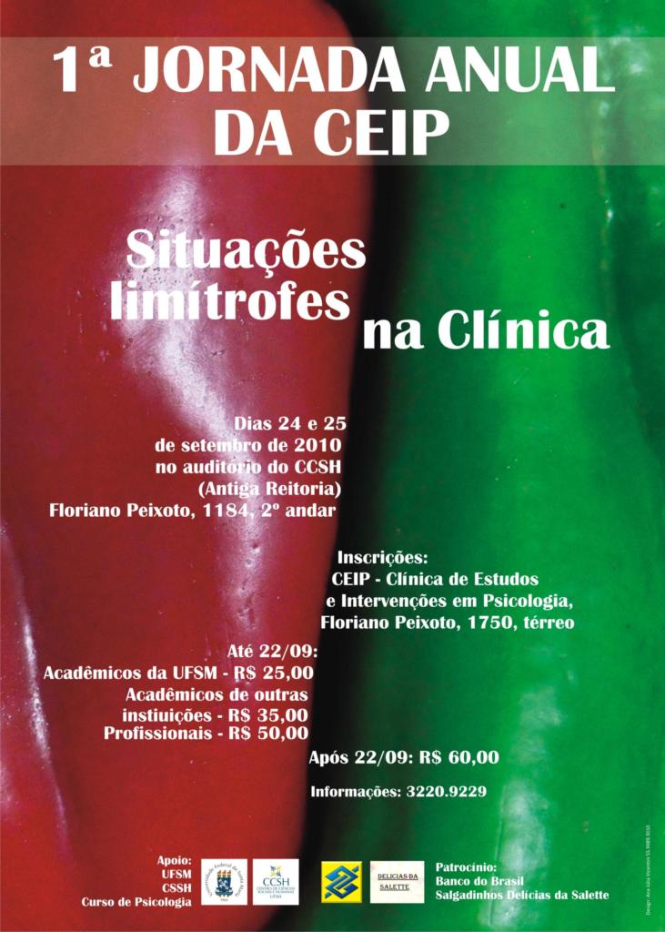 Nos dias 24 e 25 do mês de setembro de 2010, a CEIP realizou a primeira edição do evento Jornada da CEIP. O tema trabalhado foi “Situações Limítrofes na Clínica” e o evento contou com a participação de psicanalistas, como Cristian Giles, Ilka Pichin, Silvia Raimundi Ferreira, Norton Cezar Dal Follo Rosa Jr., Eduardo Ely Mendes Ribeiro, entre outros.
