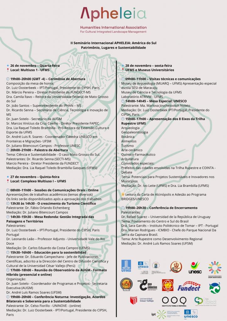 O II Seminário Internacional APHELEIA América do Sul: Patrimônio, Lugares e Sustentabilidade acontecerá entre os dias 26 e 28 de novembro de 2025 em Campo Grande, Mato Grosso do Sul.