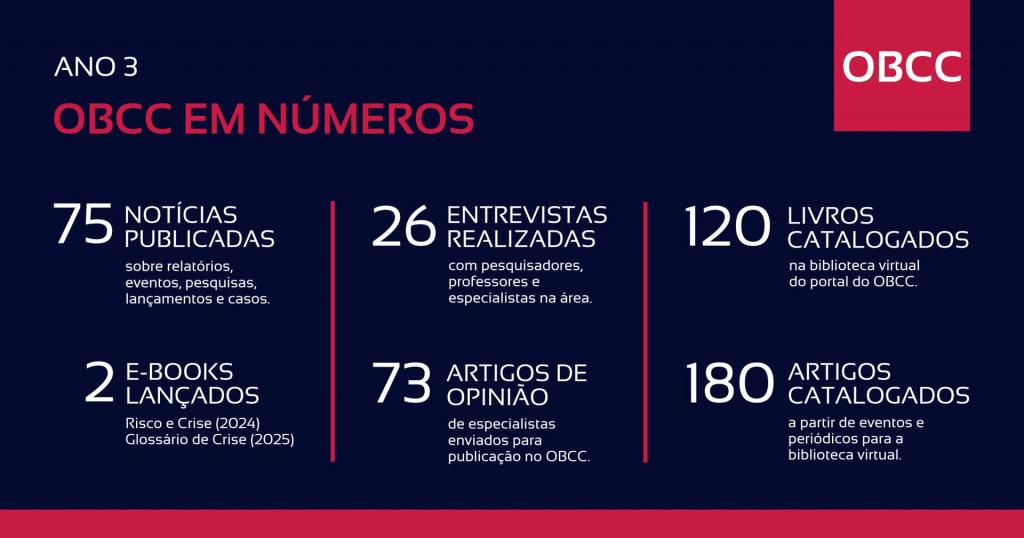 Nestes 3 anos, o OBCC buscou diversificar o formato dos conteúdos disponibilizados ao público no portal: de sugestões de filmes e séries, passando por uma biblioteca virtual de livros, capítulos de livro, artigos científicos, teses e dissertações, a links de relatórios internacionais. Confira em números a atuação do Observatório a partir da realização de entrevistas, da publicação de notícias e de artigos de opinião entre outros: