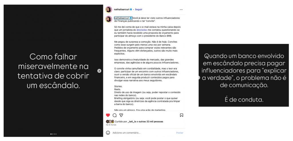 O e-mail foi disparado, supostamente, pela agência responsável pelo Banco BRB para convidar influenciadores do campo das finanças (os finfluencers) para um almoço. A presença desses influenciadores seria PAGA, com stories e 1 reels resumo. Ou seja, a ação não era de relacionamento, nem de esclarecimento, nem de gestão de crise. Era publi pura.