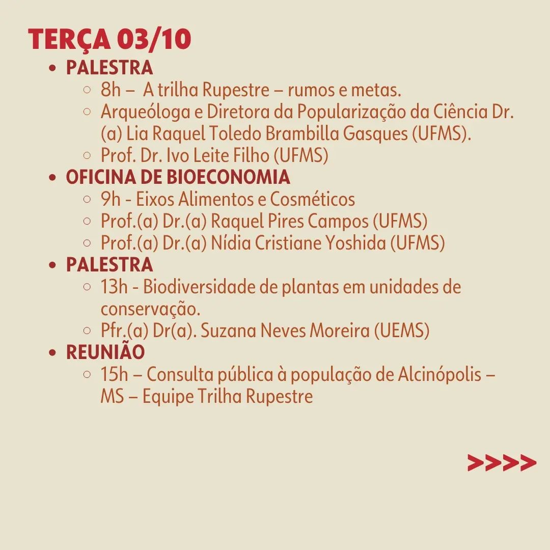 A Trilha Rupestre é um programa institucional da Universidade Federal do Mato Grosso do Sul (UFMS) que visa ao fortalecimento cultural, turístico e econômico entre os municípios sul-matogrossenses do corredor ecológico Cerrado-Pantanal. Algumas ações têm sido desenvolvidas para fomentar a economia local de maneira sustentável, com a capacitação da comunidade para a circulação de renda através da Bioeconomia. A Rota Rupestre pode apresentar, para além da arqueologia, o turismo sustentável, rural, ecologicamente correto e que preserva suas riquezas. O projeto pensa na “necessidade do passado” para uma melhor compreensão do presente e a projeção do futuro. Os idealizadores do Programa Rota Rupestre são a arqueóloga Lia Brambilla e o professor Ivo Leite, ambos da UFMS. Por meio de um acordo de cooperação entre a UFMS e a Universidade Federal de Santa Maria (UFSM), o Laboratório de Arqueologia, Sociedades e Culturas das Américas (LASCA), do qual o professor André Luis Ramos Soares é o coordenador, vai colaborar com os levantamentos arqueológicos a serem realizados, a exemplo da escavação arqueológica na cidade de Alcinópolis, que fica no sítio Barro Branco. Também vamos desenvolver trabalhos relacionados à Educação Patrimonial na região. Considerando os aspectos de desenvolvimento social, cultural e dos eixos que compõe a Trilha, a Cátedra UNESCO se orgulha de apoiar este programa desde sua criação.
