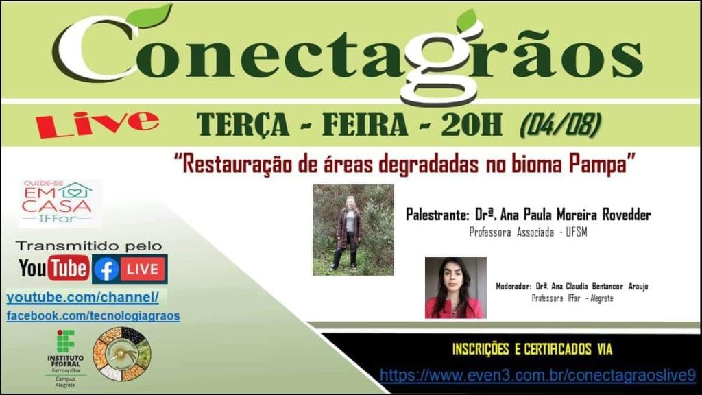 Na próxima terça-feira (04/08) acontecerá uma live sobre a Restauração de áreas degradadas no Bioma Pampa. O evento contará com a participação da professora da UFSM Drª Ana Paula Rovedder e será moderada pela professora do IFFar, Drª Ana Claudia Araujo.