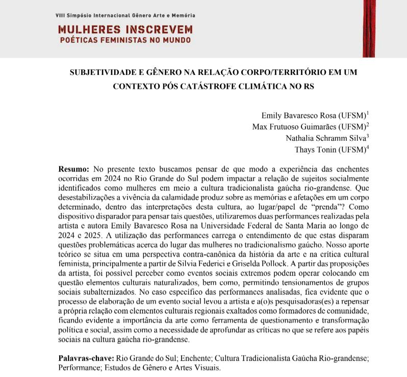 SUBJETIVIDADE E GÊNERO NA RELAÇÃO CORPO/TERRITÓRIO EM UM CONTEXTO PÓS CATÁSTROFE CLIMÁTICA NO RS - Emily Bavaresco Rosa, Max Frutuoso Guimarães, Nathalia Schramm Silva, Thays Tonin