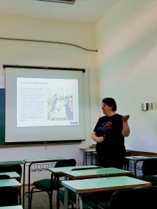 Uma mulher apresenta um slide projetado em sala de aula, gesticulando enquanto explica o conteúdo. À sua frente, há carteiras vazias, e o ambiente é iluminado pela luz natural.