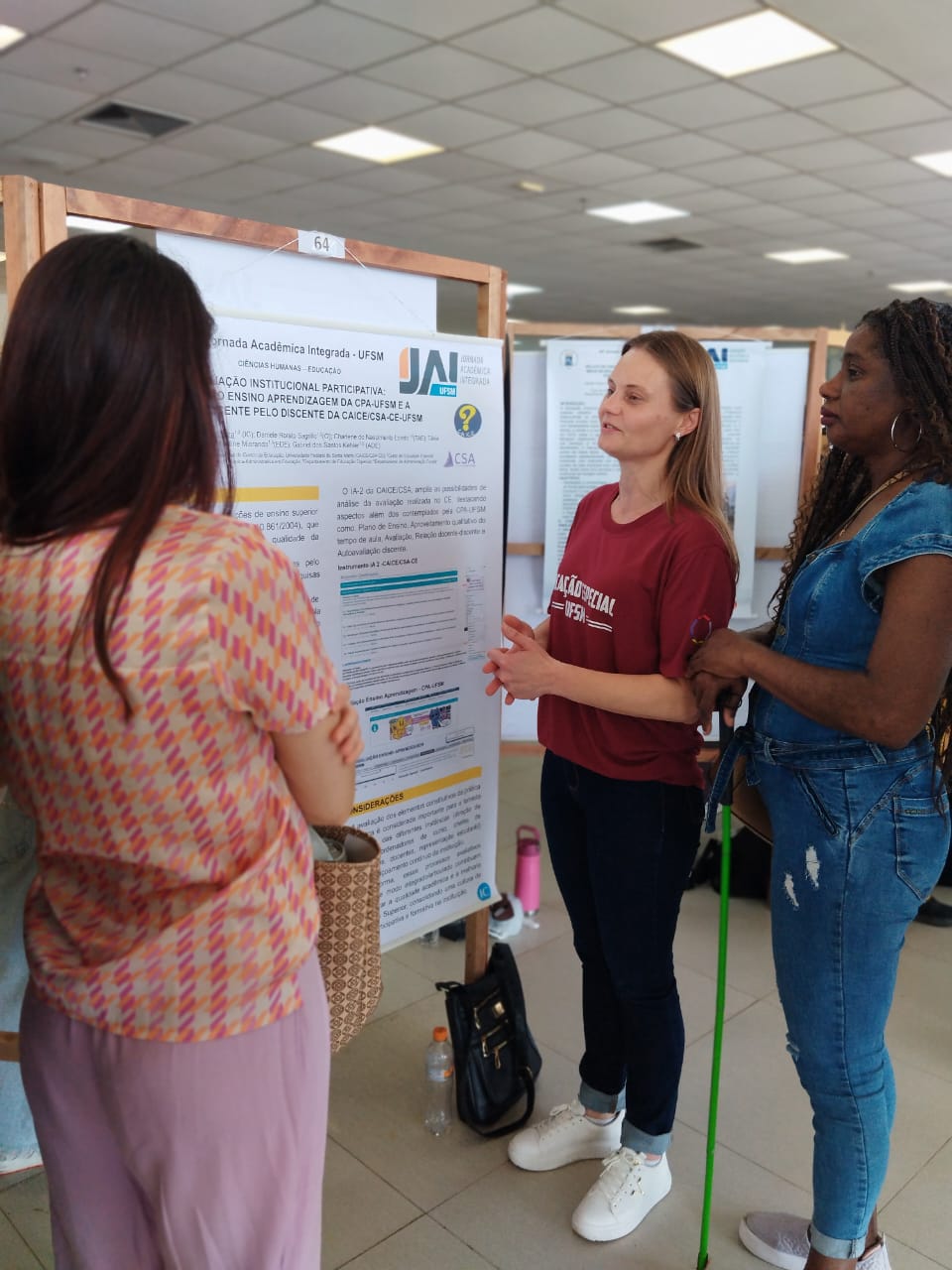 Acadêmica Denise Della Flora apresenta o banner “Avaliação Institucional Participativa: a Avaliação Ensino-Aprendizagem da CPA-UFSM e a Avaliação Docente pelo Discente da CAICE/CSA-CE-UFSM” às alunas do Centro de Educação.