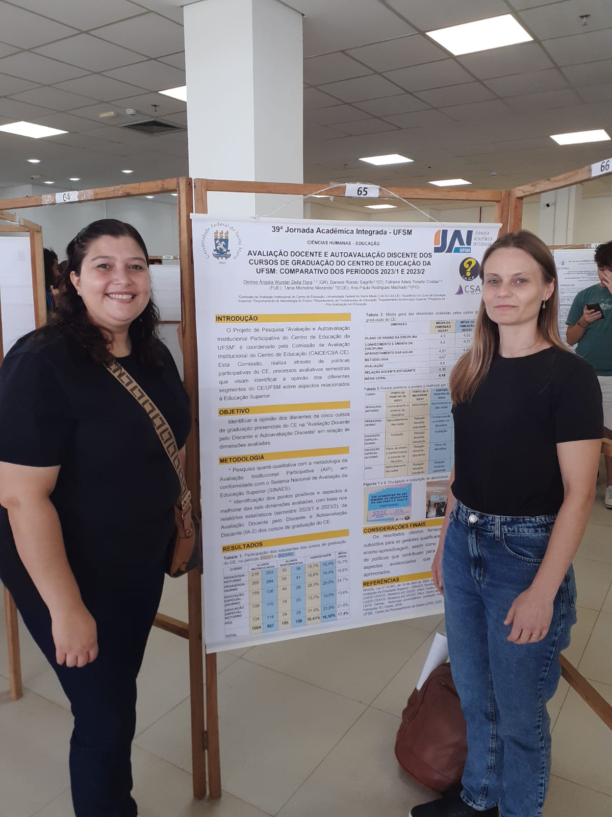 As Acadêmicas Ana Paula Rodrigues Machado (à direita) e Denise Ângela Della Flora junto ao banner durante a sessão de exposição, no Centro de Eventos da Universidade