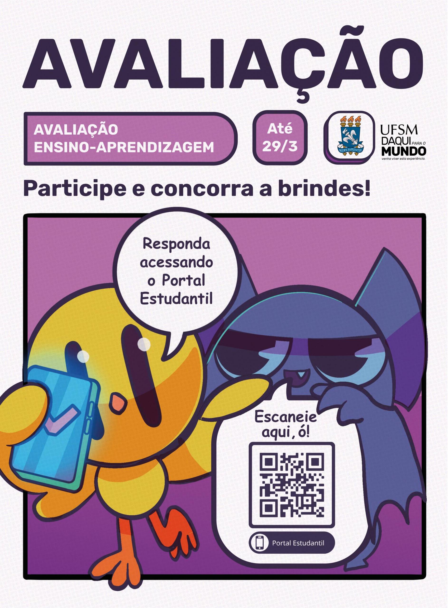 O questionário da avaliação ensino-aprendizagem referente ao segundo semestre de 2023 estará disponível no Portal Estudantil e no aplicativo UFSM Digital até 29 de março de 2024.