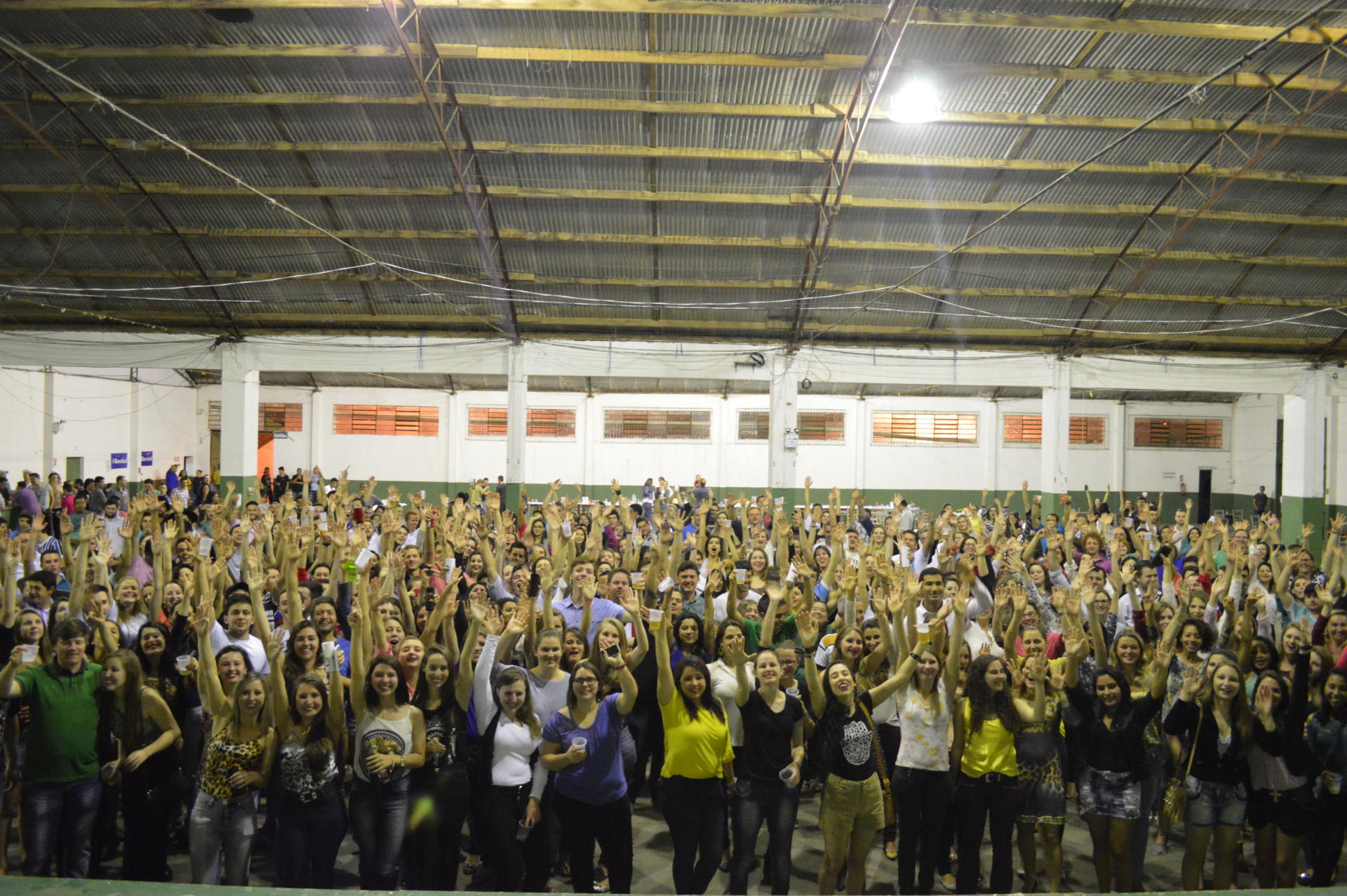 Foto horizontal colorida de dezenas de pessoas abanando dentro de um ginásio