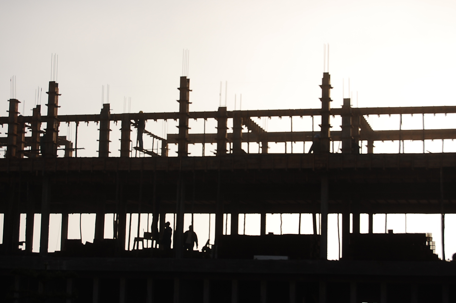 Foto horizontal de prédio em construção, com a estrutura aparente e 2 pessoas trabalhando na obra