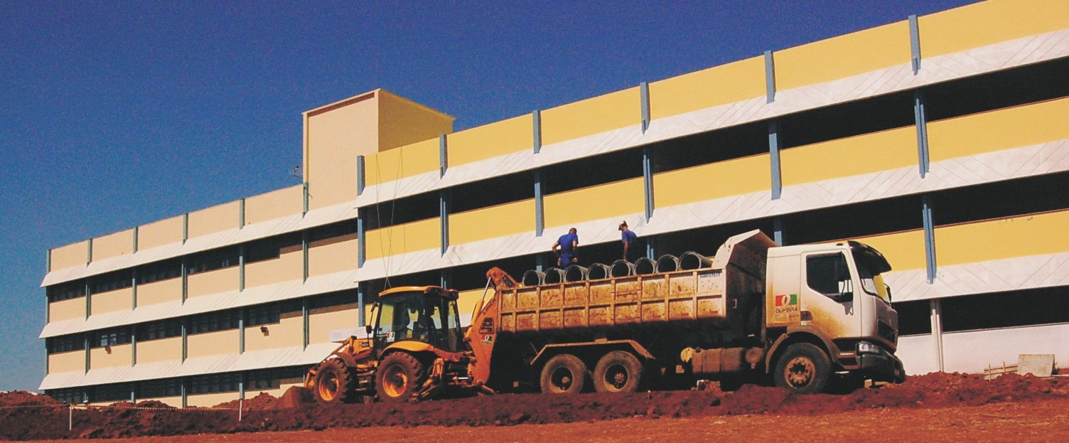 Foto horizontal colorida de prédio de 4 andares amarelo com branco e azul, na frente chão de terra vermelha, um trator e um caminhão com 2 trabalhadores em cima