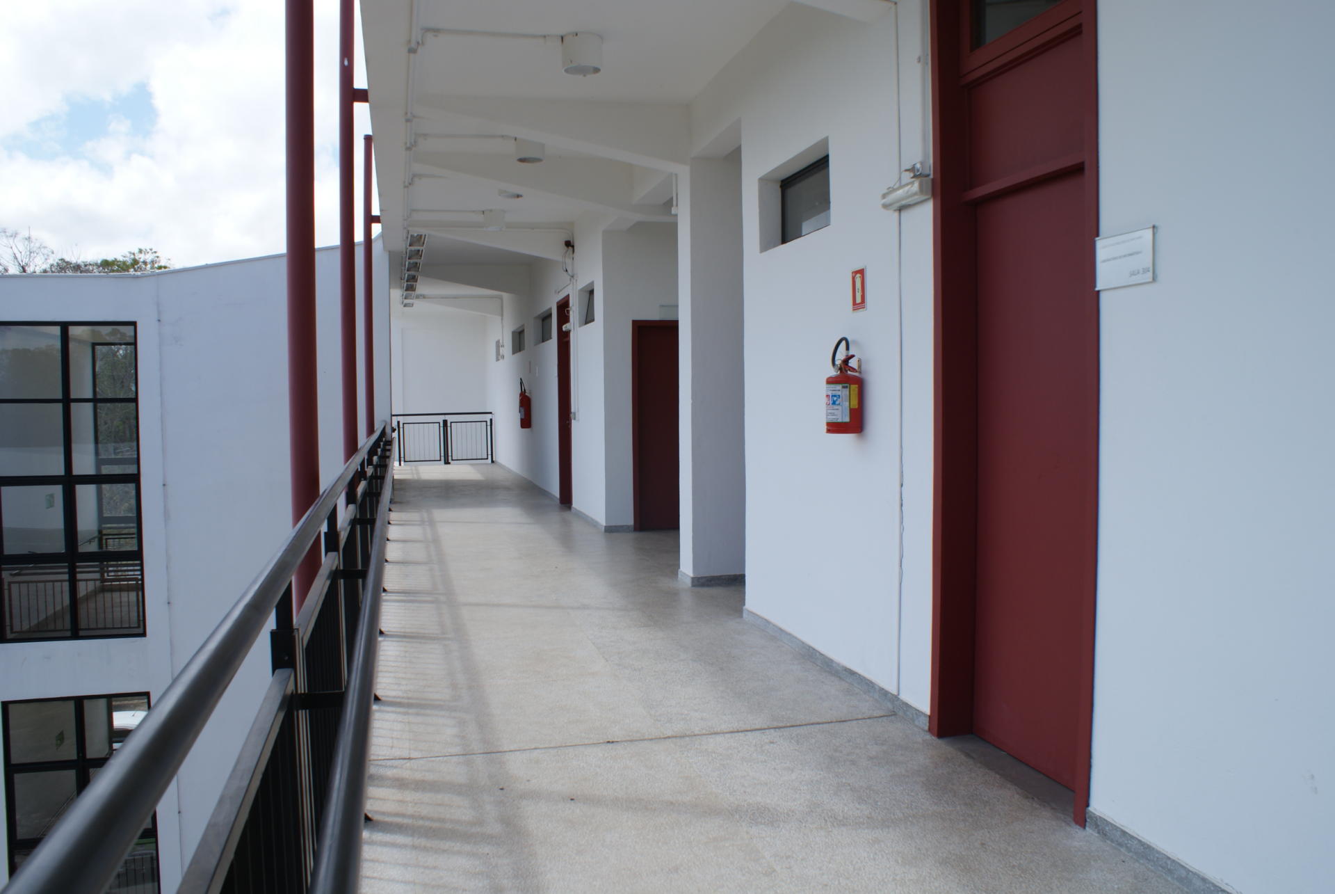 Fotografia horizontal colorida da Inauguração do Prédio de Laboratórios do Colégio Técnico Industrial de Santa Maria. Vê-se um andar do prédio, a esquerda, parapeito e corrimão preto, no centro, corredor comprido e largo de piso claro, a direita parede branca e três portas vermelhas.