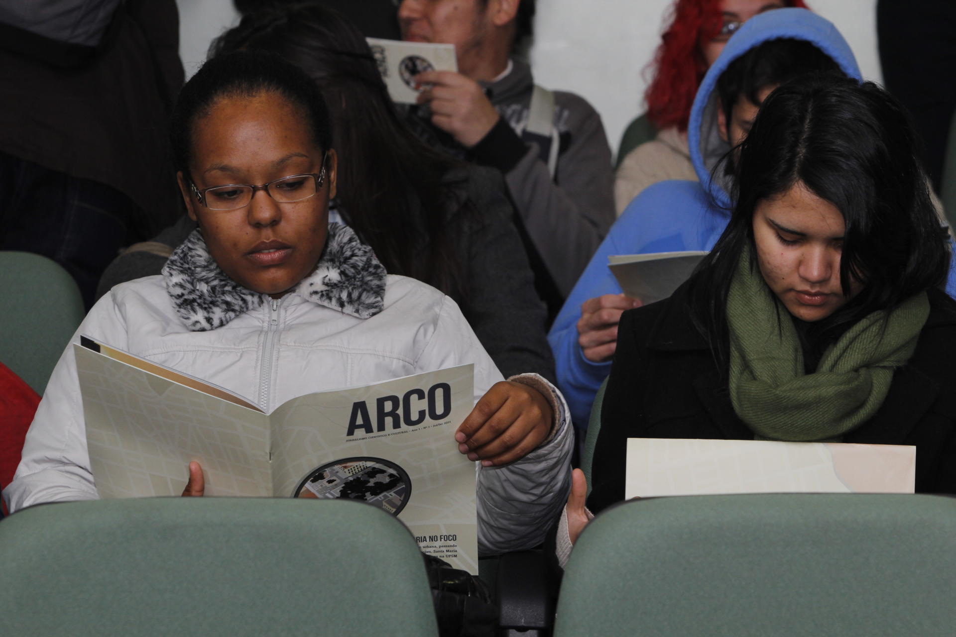 Fotografia horizontal colorida do Lançamento da Revista ARCO. Sentadas uma atrás da outra em 2 fileiras, 6 pessoas aparecem. Em destaque, 2 mulheres jovens. A da esquerda tem o rosto baixo voltado para a revista que segura com as mãos, a capa é clara e está escrito Arco no canto superior direito. Do lado direito, a outra mulher também o rosto baixo em direção a um impresso que tem em mãos.