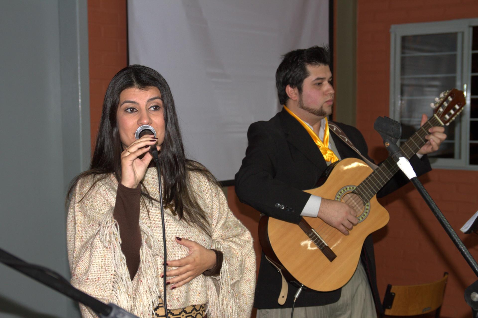 Fotografia horizontal colorida da inauguração do Centro Cultural do Departamento de Tradições Gaúchas Noel Guarany. A esquerda, uma mulher jovem segura um microfone em frente a boca. A direita, um homem jovem segura e toca um violão.