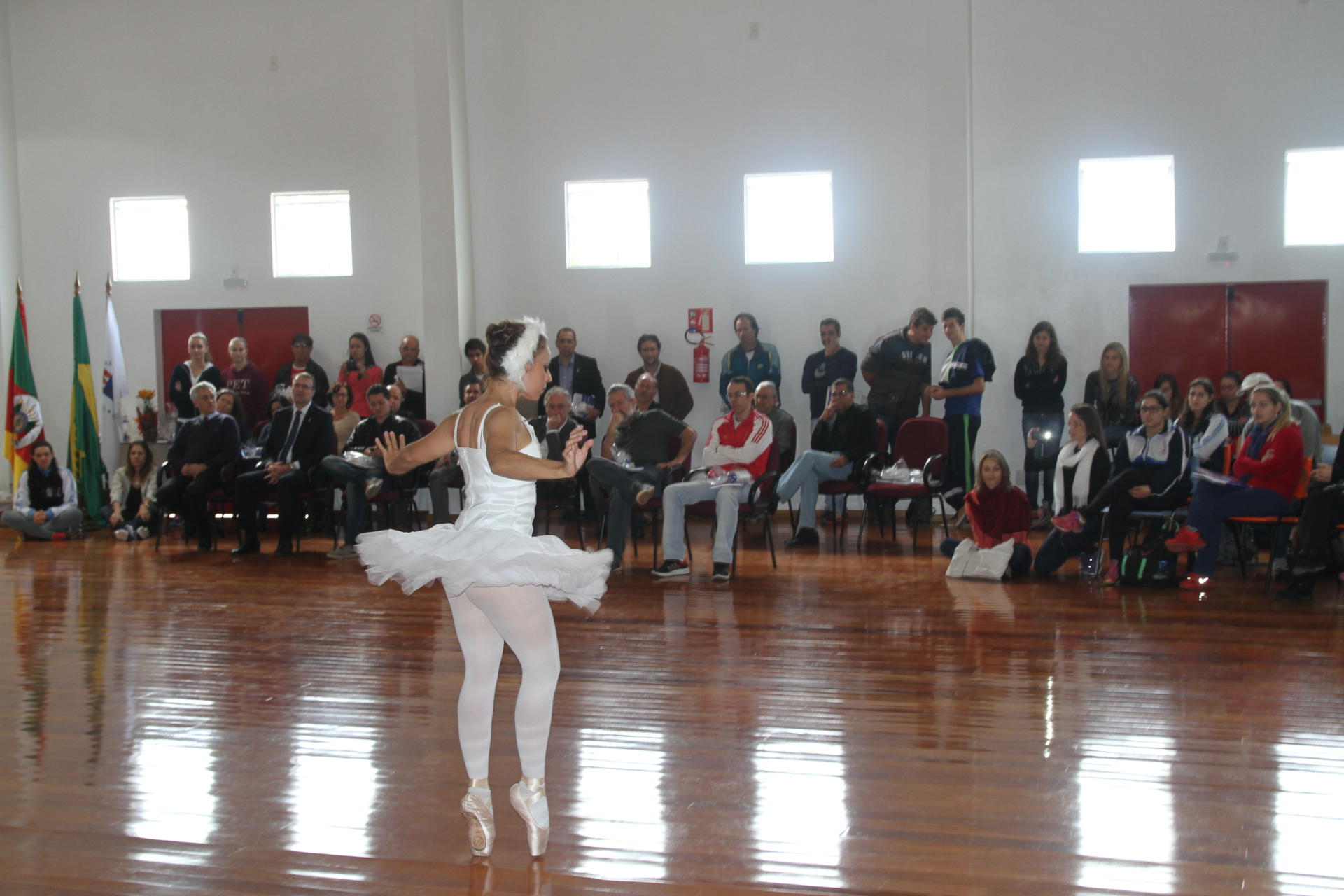 Fotografia horizontal colorida da Inauguração do Complexo Didático e Artístico. Em uma sala ampla de piso escuro, uma mulher está no centro na ponta dos pés, de roupa branca, em pose de ballet. Ao fundo, 39 pessoas olham em direção a mulher.