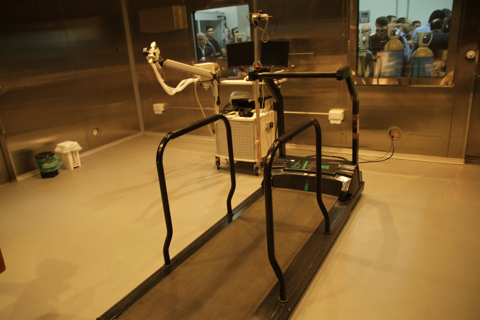 Fotografia horizontal colorida da Inauguração do Laboratório de Performance em ambiente simulado internamente. No centro, uma esteira de corrida, na parede ao fundo, duas janelas de vidro.