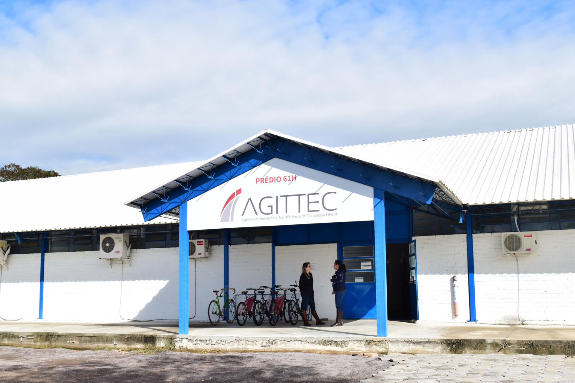 Fotografia horizontal colorida de um prédio da Cidade Universitária. Ele tem um pavimento, pintura branca com detalhes verticais na cor azul. No centro, um hall de entrada com cobertura, os pilares são azuis. No topo da fachada, uma placa branca escrito Prédio 61H Agittec. Cinco bicicletas estão estacionadas a esquerda no hall e a direita 2 mulheres em pé.
