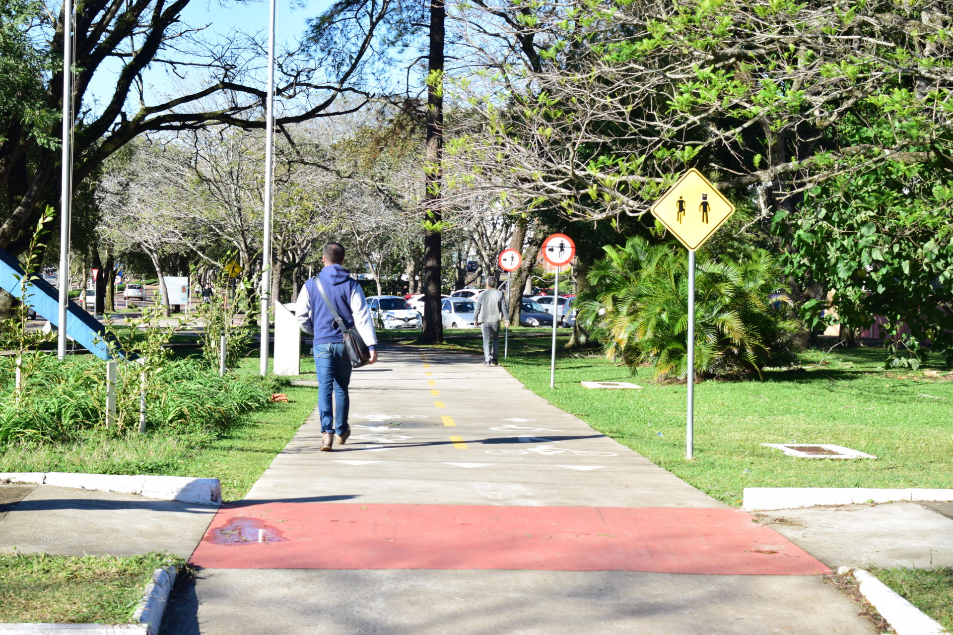 Foto horizontal colorida de pista de caminhadas e bicicletas, na altura do Arco de entrada do campus, com 2 pessoas caminhando de costas