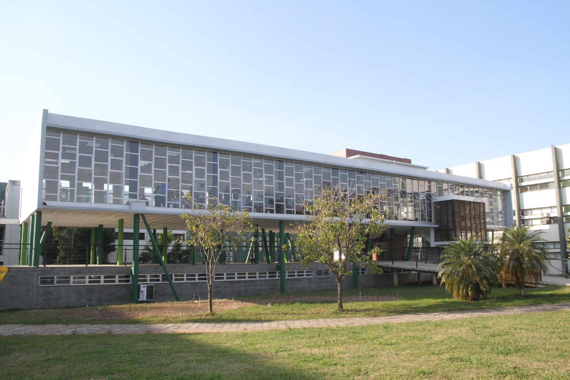 Fotografia horizontal colorida da Inauguração dos novos prédios do Centro de Ciências Rurais (CCR). Na imagem, fachada do prédio da Biblioteca do CCR de dois pavimentos. No primeiro, uma rampa de acesso leva a um amplo hall, fica aparente diversos pilares cilíndricos em tons de verde verticais e diagonais. No andar acima, inúmeras janelas de vidro de cima a baixo e por toda a extensão. Céu claro.