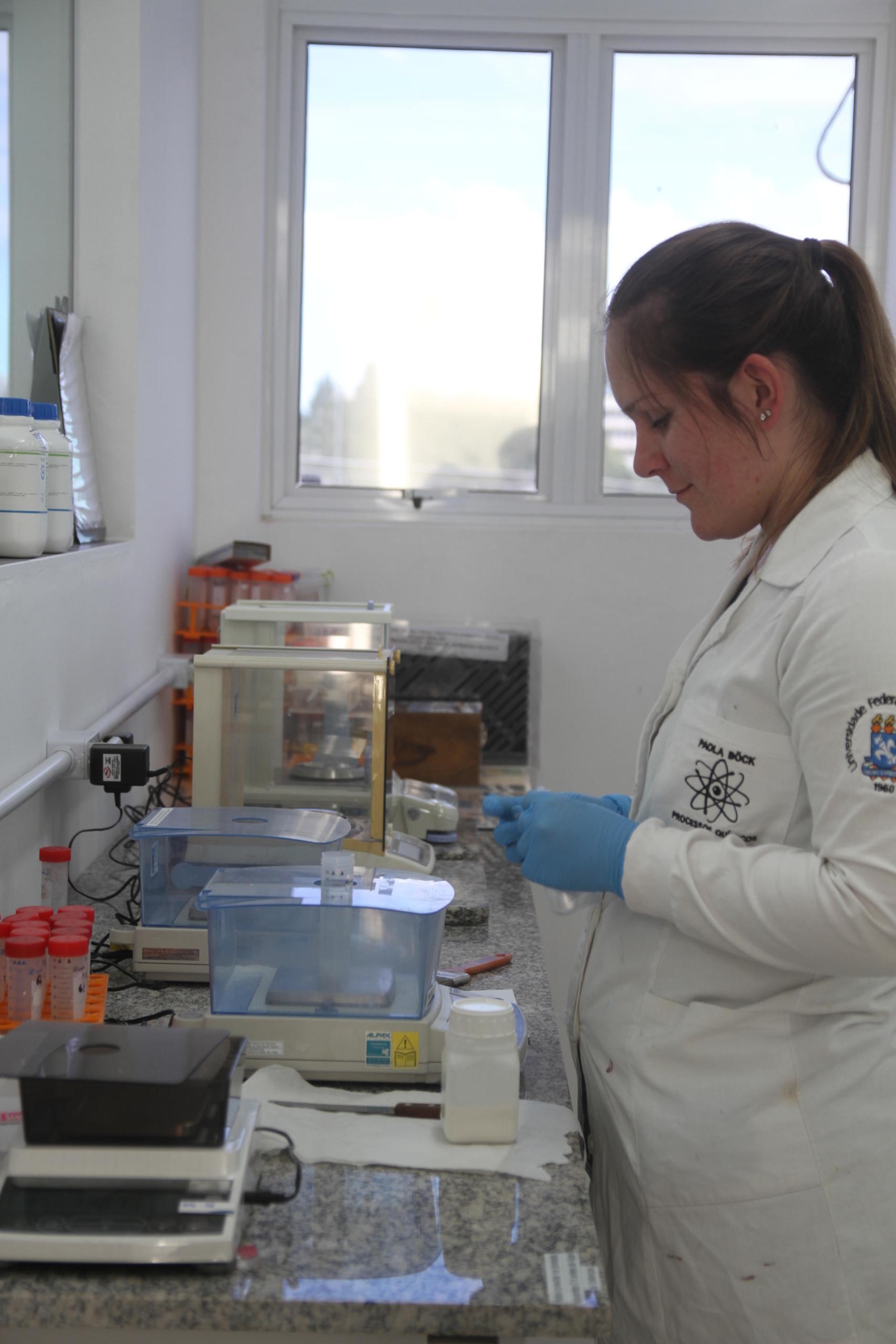 Foto vertical colorida de mulher usando jaleco branco e luvas azuis em frente à bancada com diversos recipientes de laboratório.