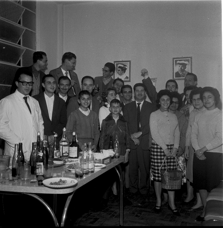Fotografia quadrada preto e branca de 20 pessoas atrás de uma mesa com garrafas de bebidas na confraternização de inauguração do Centro dos Funcionários da UFSM.