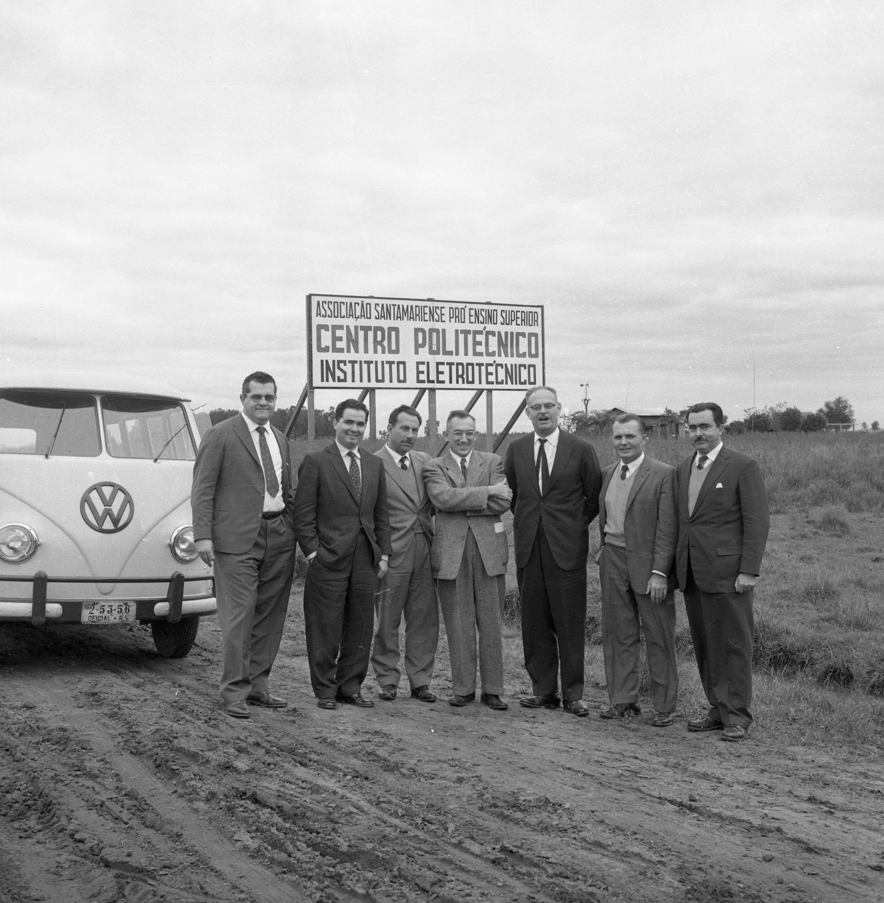 Fotografia quadrada preto e branca de 7 homens em uma estrada de chão em frente de uma Kombi e de uma placa escrita "Associação Santamariense Pró-Ensino Superior - Centro Politécnico - Instituto Eletrotécnico".