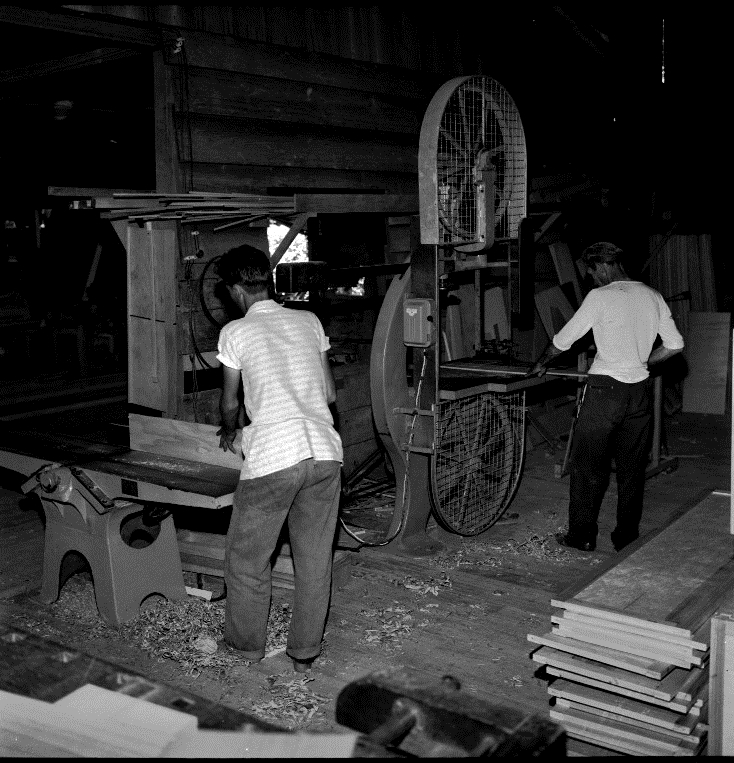 Fotografia quadrada preto e branca de um espaço interno com duas máquinas de serraria. A frente delas, 2 homens jovens trabalham. Na borda inferior direita 13 taboas de madeiras empilhadas.