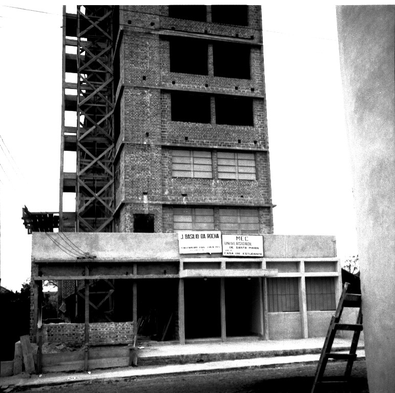 Fotografia quadrada preto e branca do prédio da Casa do Estudante Universitário I em construção, localizado na Rua Professor Braga. Na imagem estão aparentes 6 pavimentos, na fachada do primeiro estão 2 placas escritas J Basilio da Rocha e na outra MEC Universidade de Santa Maria Casa do Estudante.