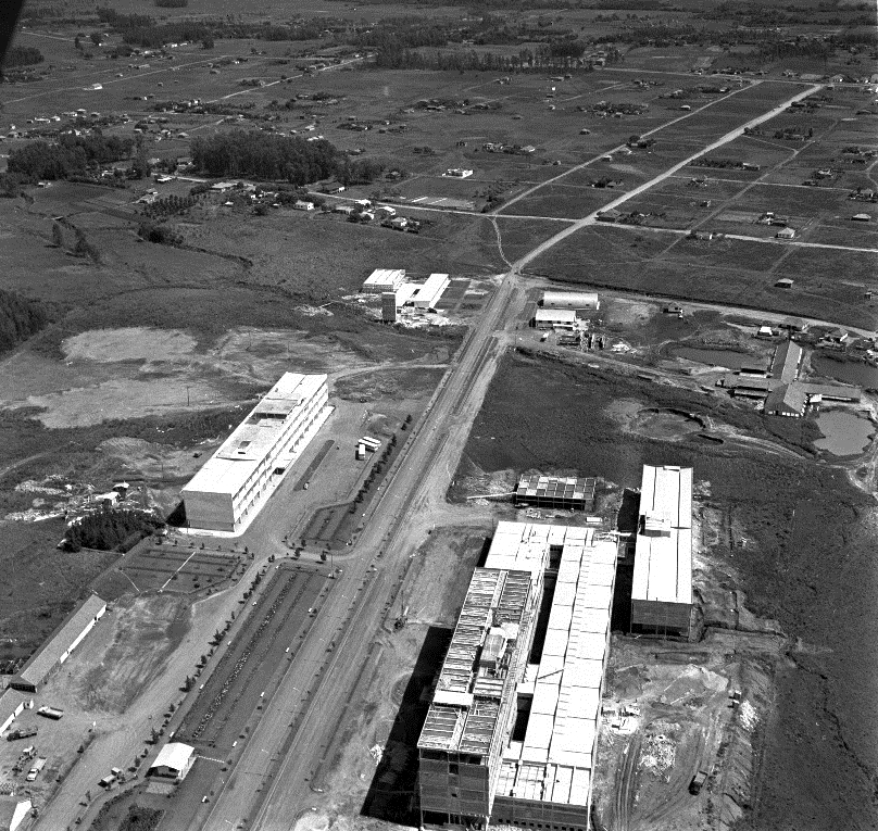 Fotografia horizontal preto e branca da vista aérea da Avenida Roraima com visão das instalações do Colégio Técnico Industrial de Santa Maria ao centro. Em frente, dois pavilhões e ao lado esquerdo outra construção. Ao fundo campo com vegetação.