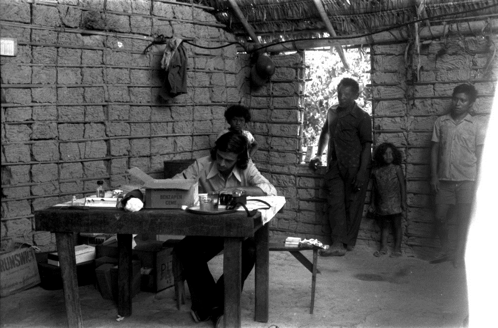 Fotografia horizontal preto e branca de uma atividade no Projeto Rondon na cidade de Boa Vista, Roraima. Em um ambiente construído por barro e palha, vê-se 4 pessoas em pé escoradas nas paredes que observam um homem, que está de costas para eles, sentado em um banco atrás de uma mesa.
