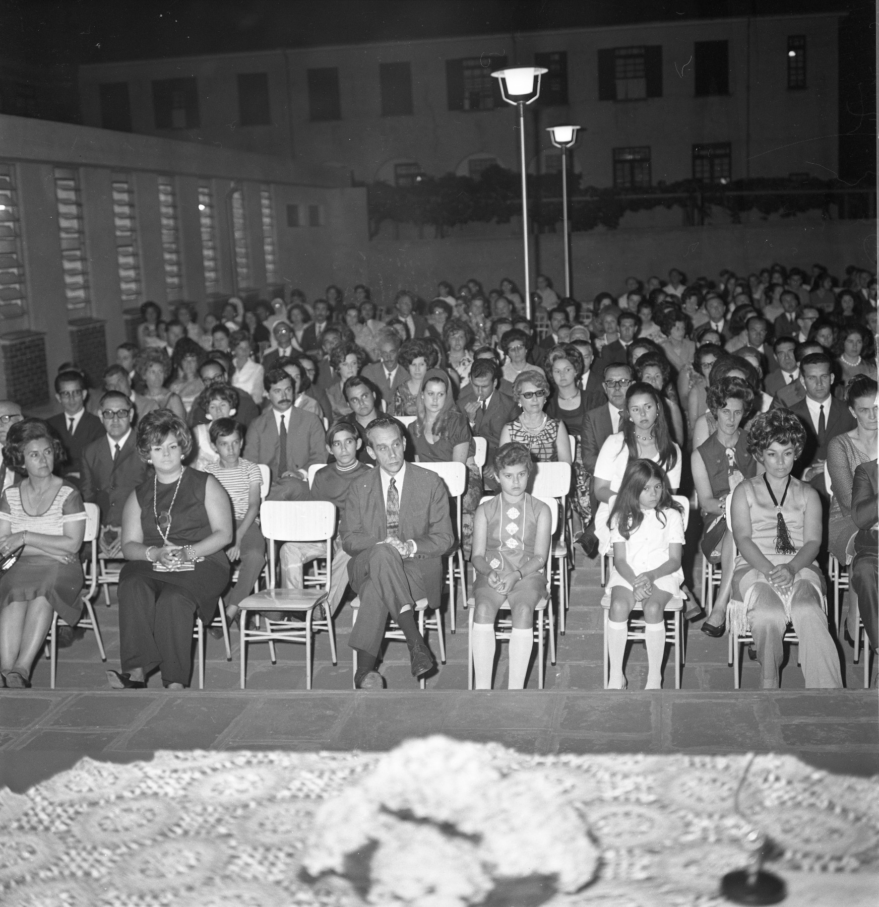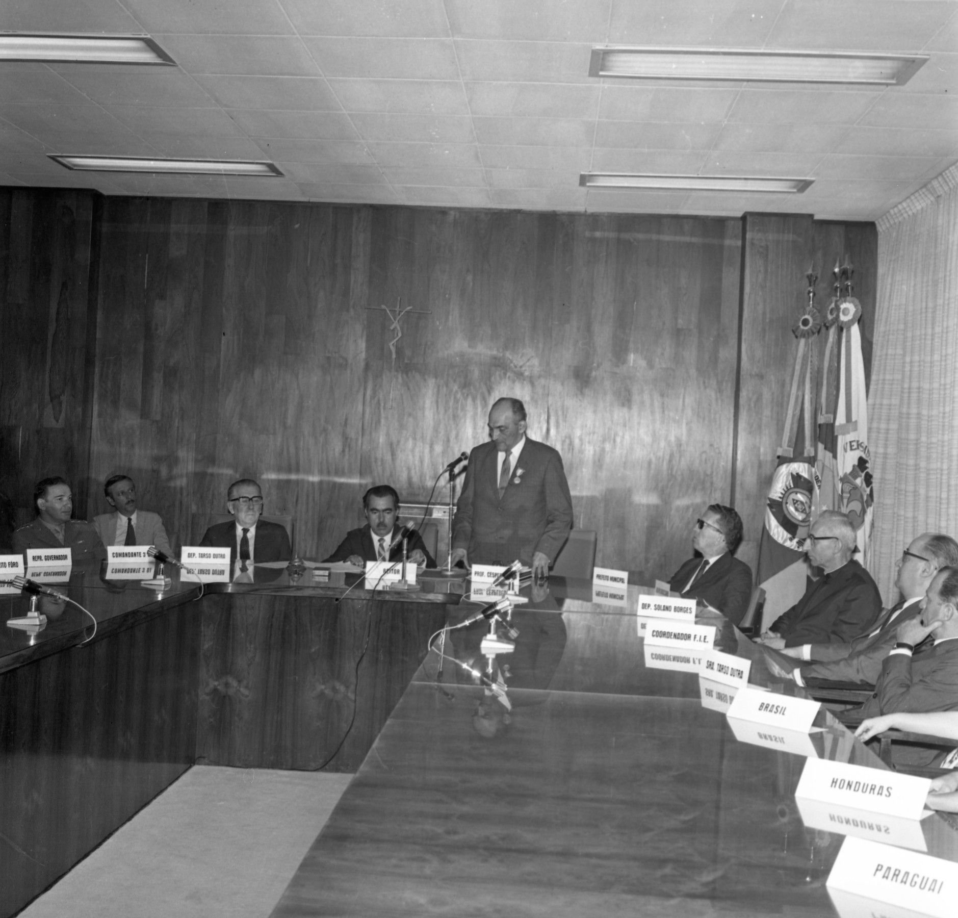 1970 - Aula inaugural da Faculdade Interamericana de Educação com o pronunciamento do prof. Dr. Francisco Céspedes, diretor do Departamento de Assuntos Educativos da Organização dos Estados Americanos (Foto UFSM.1970.014.014 de fotógrafo não identificado)