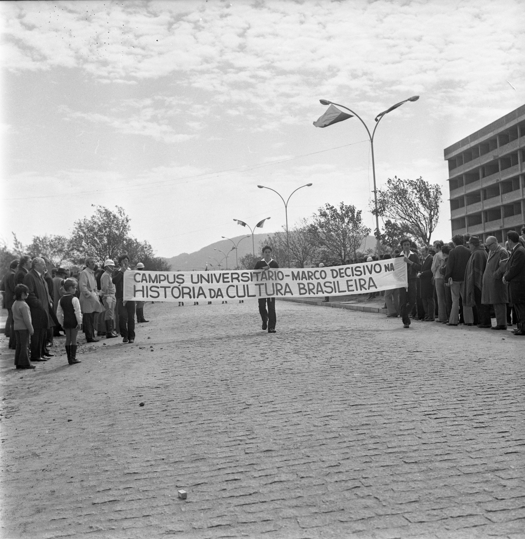 Fotografia quadrada preto e branca de um desfile na Inauguração da primeira fase do Campus e da Biblioteca Central na Cidade Universitária. Na rua de paralelepípedo, 3 pessoas caminham de frente ocupando toda a largura segurando uma faixa larga branca escrito Campus Universitário-Marco decisivo na História da Cultura Brasileira. De cada lado da rua, o público acompanha.